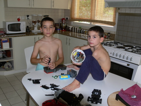 Là, c’était l’autre jour lorsqu’ils avaient décidé de dessosser tous leurs jouets cassés et d’en extraire les composants électroniques pour fabriquer un robot (on attend toujours Marco pour le robot !) ….C’était du tri sacrément sélectif ! Ils ont travaillé un week-end complet sur ce projet !